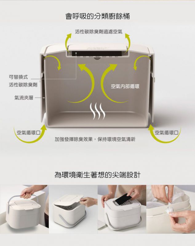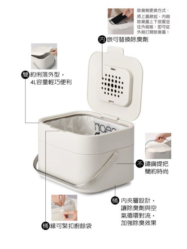 Joseph Joseph 智慧除臭廚餘機 尺寸:W23.5 x D19.7 x H16.1(cm) 4L 容量 材質:內盒和外盒:聚丙烯PP,把手:不銹鋼(304) ◆上蓋含除臭劑,桶內夾層設計,讓除臭劑與空氣循環對流 ◆加強發揮除臭效果,保持環境空氣清新 ◆除臭劑更換方式:將上蓋掀起,內側除臭蓋上下按壓並往外側推,即可從外側打開除臭蓋