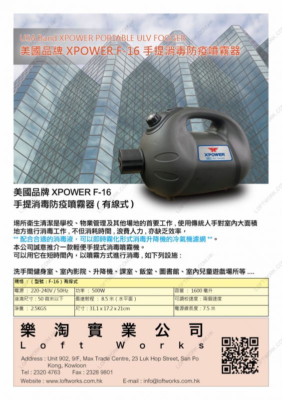美國品牌 XPOWER F-16 手提消毒防疫噴霧機(有綫式)---- (現貨) - 凡幼稚園、中小學、福利機構、老人院、青年中心、院舍 及非牟利機構,可享特別折扣優惠,以支持防疫工作。 簡介 : 埸所衛生清潔是學校、物業管理及其他場地的首要工作, 使用傳統人手對室內大面積地方進行消毒工作, 不但消耗時間,浪費人力,亦缺乏效率, **配合合適的消毒液,可以即時霧化形式消毒升降機顶的冷氣機濾網**。 本公司誠意推介一款輕便手提式消毒噴霧機。 可以用它在短時間內,以噴霧方式進行消毒,如下列設施: 1.洗手間 2.健身室 3.室內影院 4.升降機 5. 課室、飯堂、圖書館等 6. 室內兒童遊戲場所等.... 規格: 型號 : F-16 (有綫式 ) - 功率 : 500W - 最大液體容量是 : 1600毫升,最遠的射程是 : 8.5米 - 液滴尺寸是 50微米以下 - 如距離目標1米的距離噴灑 , 則它的有效扇形直徑是:25-30cm - F-16 的電線長度是 7.5 米 ** 注意 : 不能加入酒精等易燃液體噴曬 , 以免引起火警 !